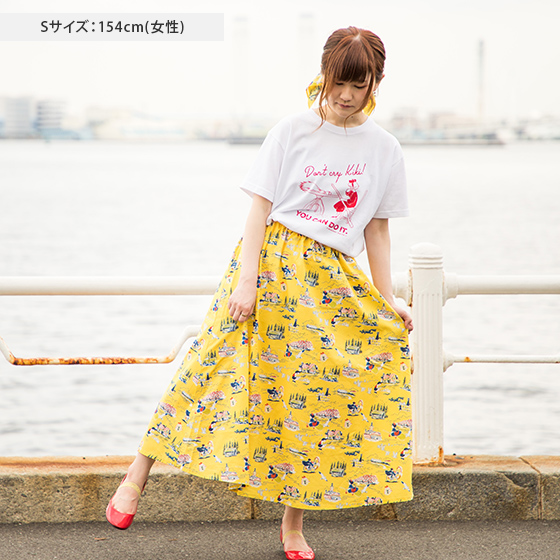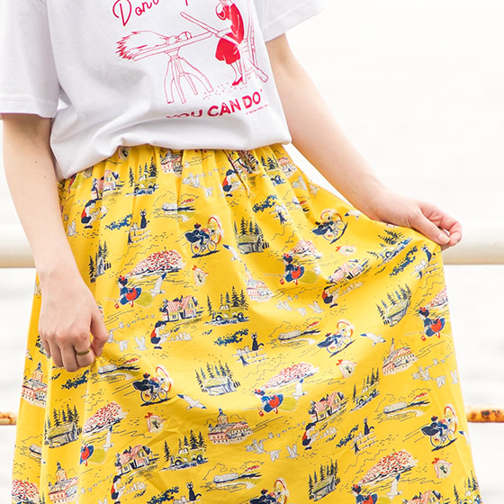 キキがコリコの街で出会ったたくさんのモノや人たち、いろんな思い出がいっぱい詰まったデザイン。ベースの黄色は落ち着いたカラーなので、普段のコーディネートに取り入れやすいのもポイントです。